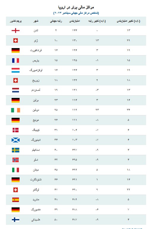 تازه‌ترین رتبه‌بندی شاخص مراکز مالی جهانی (GFCI) نشان داد که هفت شهر اروپایی در میان ۲۰ مرکز مالی برتر جهان قرار دارد.