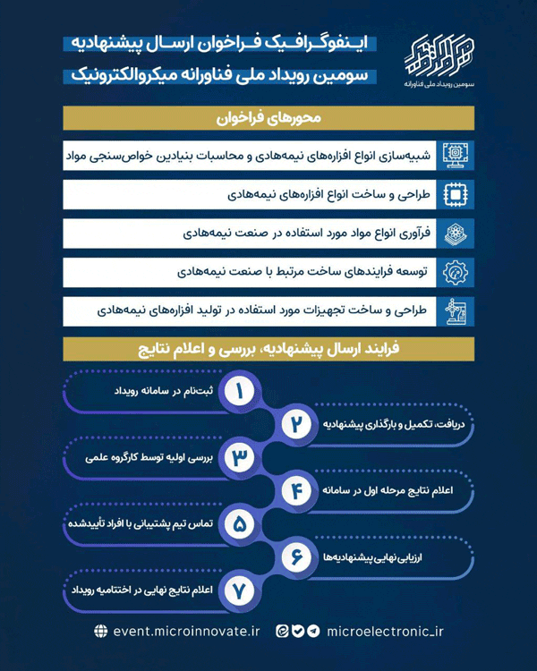 کسبوکارهای نوپا:سومین رویداد ملی فناورانه میکرو الکترونیک از سوی مرکز رشد میکرو الکترونیک و مرکز اپتو الکترونیک دانشگاه علم و صنعت ایران با حمایت مالی معاونت علمی فناوری و اقتصاد دانش بنیان ریاست جمهوری و برنامه ملی میکرو الکترونیک به میزبانی دانشگاه علم و صنعت ایران ؛برگزار می شود.