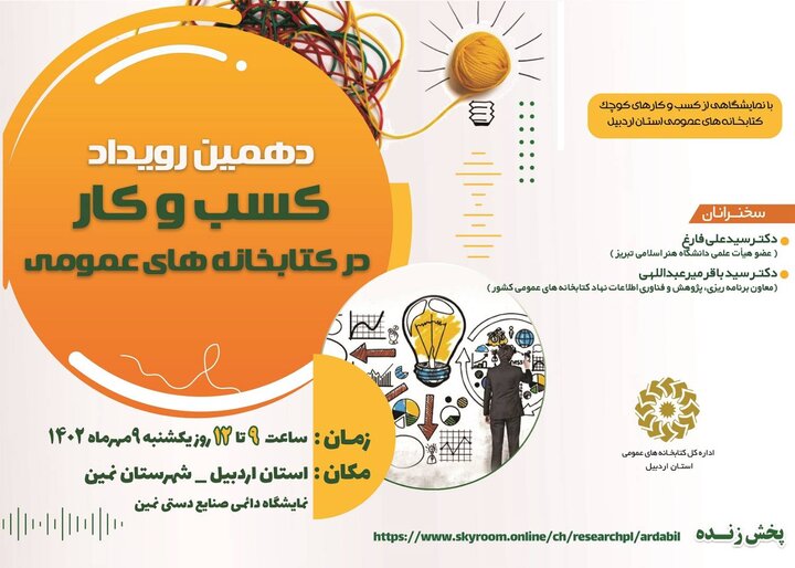 کسبوکارهای نوپا:همایش کسب و کار در شهرستان نمین برگزار می شود.دهمین رویداد کتابخانه ها عمومی و کسب و کارهای کوچک در روز یک شنبه ۹ مهرماه رأس ساعت ۱۰ صبح به میزبانی اداره کتابخانه های عمومی شهرستان نمین در محل نمایشگاه دائمی صنایع دستی این شهرستان برگزار خواهد شد.