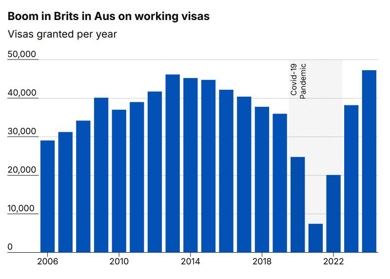 بدین ترتیب تعداد زیادی ازبریتانیایی ها به استرالیا هجوم می آورند تا ضمن لذت بردن از سبک زندگی آرام استرالیایی، درآمد هم کسب کنند. نزدیک به ۵۰هزار بریتانیایی با ویزای تعطیلات کاری امسال از بین بیش از ۲۰۰هزار متقاضی وارد استرالیا شده اند که یک رکورد جدید است. این میزان مهاجرت با کاهش قوانین ویزا افزایش یافته است که باعث افزایش سن محدودیت برای متقاضیان بریتانیا از ۳۰ به ۳۵ سال، اجازه اقامت سه ساله و حذف الزام برای انجام ۸۸روز کار در مزرعه شد.