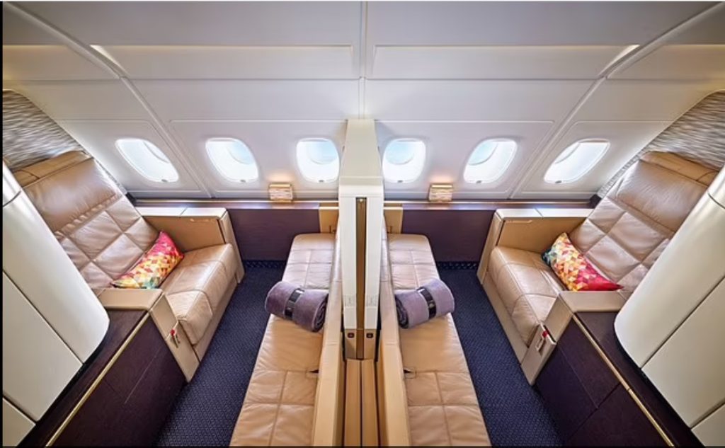 این گروه خبری ادامه داد: سر تخت مجهز به فناوری تاشو است که به مسافران این امکان را می دهد تا در حالت خوابیده به راحتی فیلم تماشا کنند. علاوه بر این، می توان آن را به یک تخت دو نفره ایجاد کرد کانال خبری رتبه بندی های خطوط پروازی میگوید: «هر سوئیت با درهای بسته، تختهای کاملاً مسطح با ملافههای درجه یک و نورپردازی جذاب ارائه میشود.» میتوان از یک پرواز مجلل مشابه در یک سوئیت درجه یک خطوط پروازی اتحاد لذت برد. «غذاخوری یک ویژگی برجسته است، برای مسافران از غذاهای لذیذ à la carte سرو میشوند که روی ظروف چینی استخوانی خوب و نوشیدنیها در ظروف شیشهای درجه یک سرو میشود. در مسیرهای منتخب، یک سرآشپز داخل هواپیما، وعدههای غذایی را بر اساس ترجیحات شخصی خود تنظیم میکند.