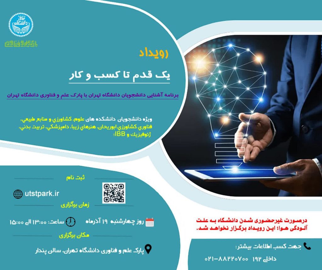 کسب‌وکارهای نوپا:رویداد «یک قدم تا کسب و کار» از سوی  پارک علم و فناوری دانشگاه تهران برگزار می‌شود.