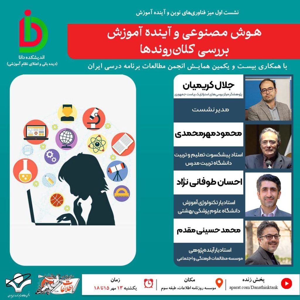 کسبوکارهای نوپا:نشست هوش مصنوعی و آینده آموزش؛ بررسی کلانروندها؛نشست اول میز فناوریهای نوین و آینده آموزش اندیشکده دانا با همکاری بیست و یکمین همایش انجمن مطالعات برنامه درسی برگزار میشود.