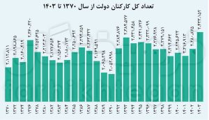 کسبوکارهای نوپا:بررسی آمار کارکنان دولت از سال ۱۳۷۰ تا ۱ل ۱۴۰۳ خورشیدی؛بیانگر این نکته است که ۴۵ درصد کارکنان دولت، زنان هستند 🔹تعداد کل کارکنان: